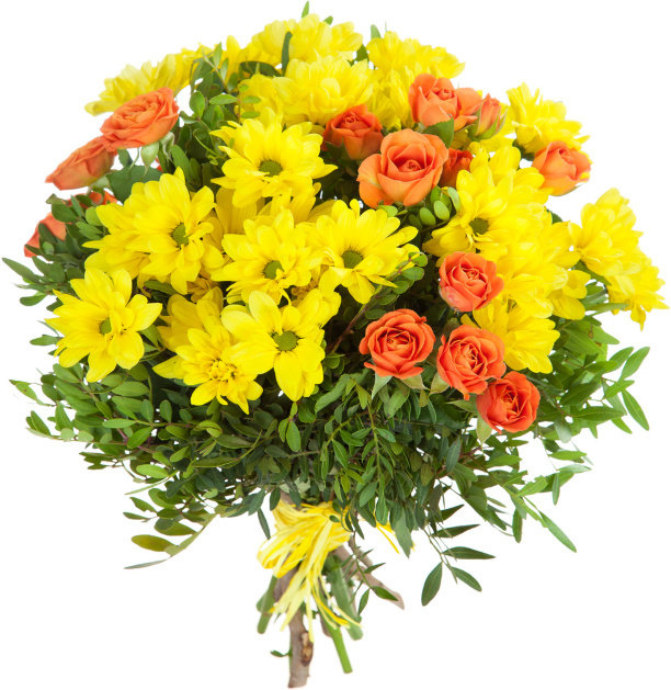 Букет из ярких, красивейших желтых хризантем, именуемых царицей осени, и восхитительных благоухающих кустовых роз, окутанных изумрудным облаком чудесной зелени писташ, символизирует крепкую любовь и романтику, долголетие и защиту от болезней и несчастий. Этот букет станет замечательным подарком  на юбилей, годовщину свадьбы и для других важных событий.